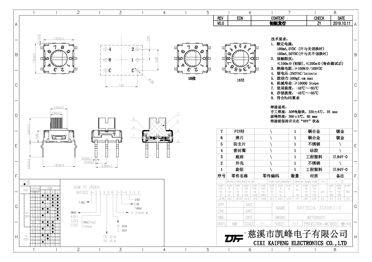 旋钮开关 材质电镀:性能说明额定电流开与关切换时100mA,5VDC开与关不切换时100mA,50VDC接触电阻≤100mΩ(初始),≤200mΩ(寿命测试后)绝缘电阻≥100mΩ/100VDC耐电压250VAC/1min操作力500gf.cm/Max机械寿命≥10000 Steps密封性IP67使用温度-40℃~+85℃储存温度-40℃~+85℃材质说明底座工程塑料,UL94V-0盖板工程塑料,UL94