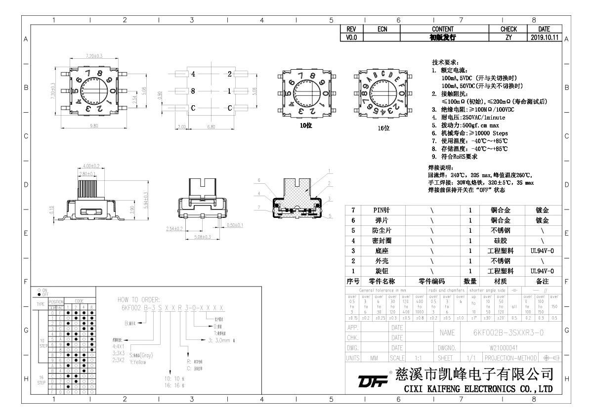 旋钮开关 材质电镀:额定电流开与关切换时100mA,5VDC开与关不切换时100mA,50VDC接触电阻≤100mΩ(初始),≤200mΩ(寿命测试后)绝缘电阻≥100mΩ/100VDC耐电压250VAC/1min操作力500gf.cm/Max机械寿命≥10000 Steps密封性IP67使用温度-40℃~+85℃储存温度-40℃~+85℃材质说明底座工程塑料,UL94V-0盖板工程塑料,UL94