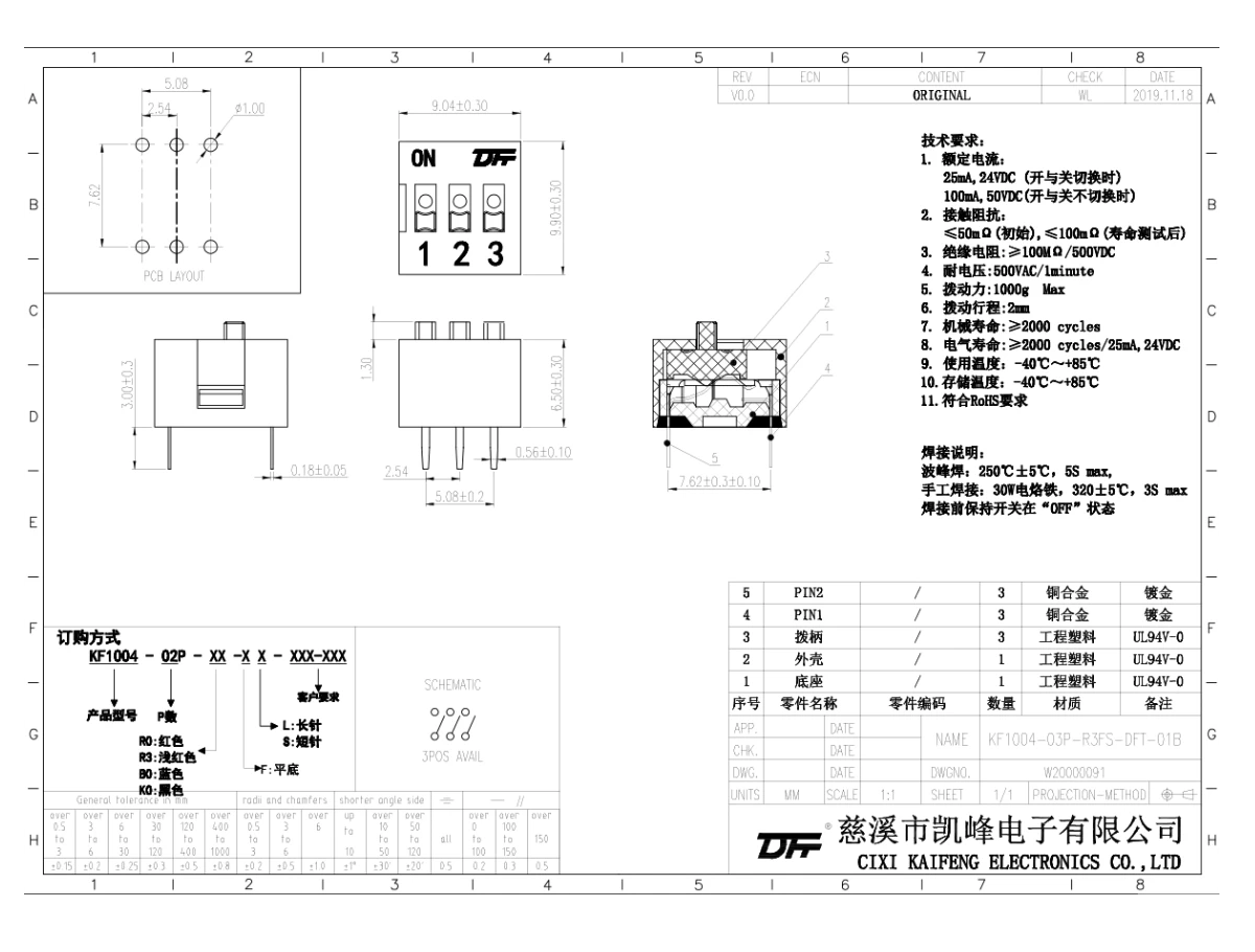 拨码开关 材质电镀:UL94V-0 工程塑料,黑色 上盖:UL94V-0 工程塑料,红色 蓝色 黑色 推钮:UL94V-0 工程塑料,白色端子:磷青铜镀金 电气性能电气寿命:在电压24VDC电流25mA之下测试,可来回拨动2000次开关不常切换的额定电流:100mA,耐压50VDC开关经常切换