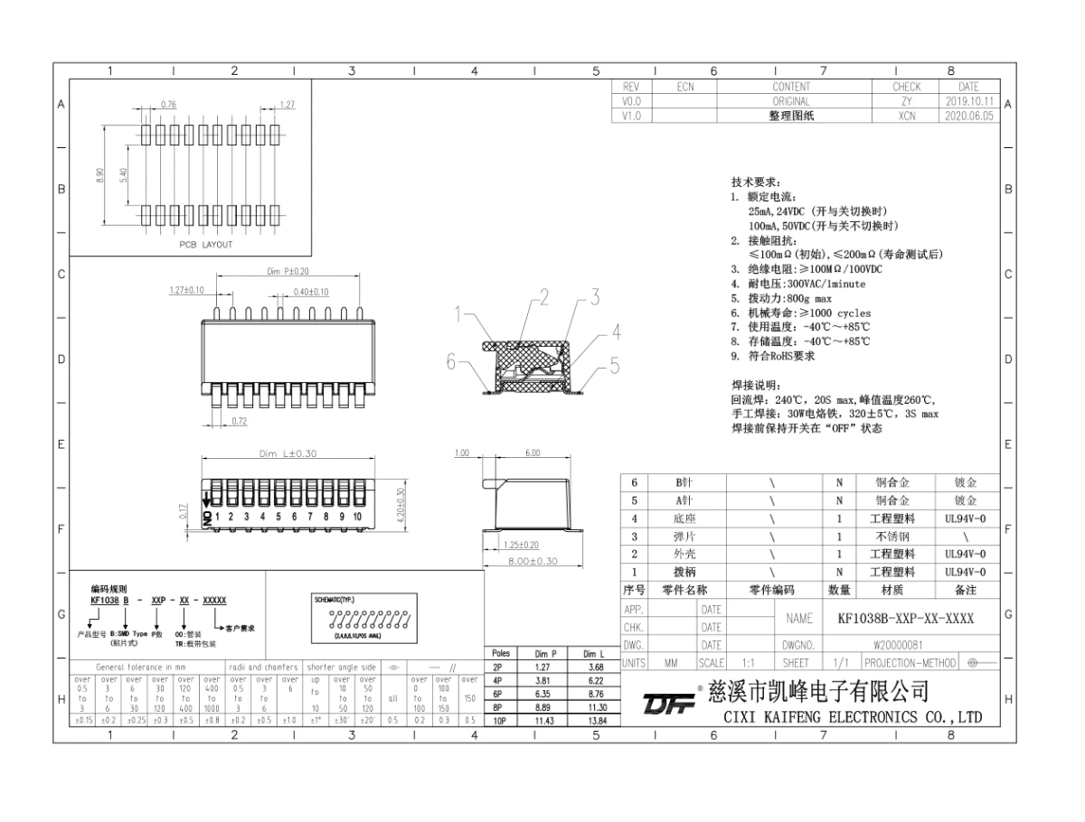 拨码开关 材质电镀:25mA,24VDC开关不切换的额定电流100mA,50VDC接触电阻初始值≤100mΩ测试后≤200mΩ绝缘电阻≥100mΩ/100VDC耐电压300VAC/1min拨动力800g/Max机械寿命≥1000cycles使用温度-40℃~+85℃储存温度-40℃~+85℃材质说明外壳工程塑料,黑色底座工程塑料,黑色拨柄工程塑料,白色PIN针磷青铜镀金焊