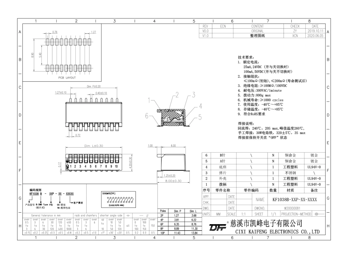 拨码开关 材质电镀:25mA,24VDC开关不切换的额定电流100mA,50VDC接触电阻初始值≤100mΩ测试后≤200mΩ绝缘电阻≥100mΩ/100VDC耐电压300VAC/1min拨动力800g/Max机械寿命≥1000cycles使用温度-40℃~+85℃储存温度-40℃~+85℃材质说明外壳工程塑料,黑色底座工程塑料,黑色拨柄工程塑料,白色PIN针磷青铜镀金焊