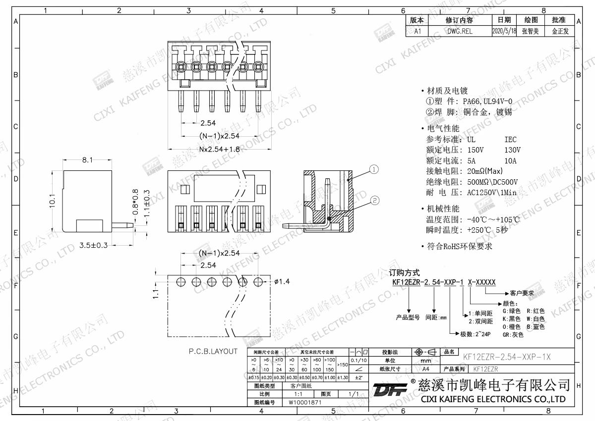 插拔式接线端子 材质电镀:触点: -焊针: 黄铜,镀锡塑件: PA66,UL94V-0电气性能ULIEC额定电压150V 130V 额定电流5A10A接触电阻20mΩ绝缘电阻500MΩ/DC500V耐电压AC1250V/1min使用线径-机械性能温度范围-40℃~+105℃ 瞬时温度+250℃,5sec扭矩-剥线长度-