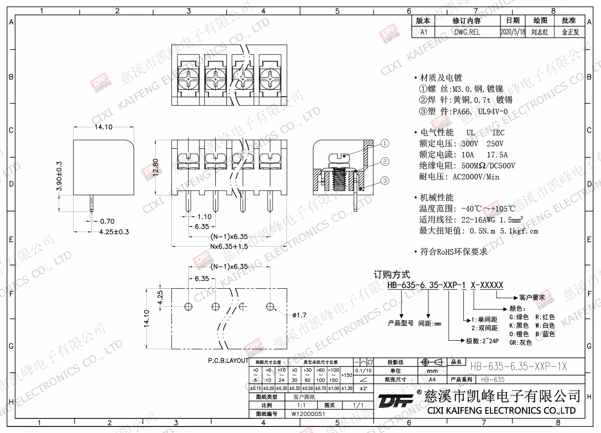 栅栏式接线端子 材质电镀:M2.5 钢,镀镍端子:黄铜,0.7t 镀镍塑件: PA66,UL94V-0电气性能ULIEC额定电压300V 250V 额定电流10A17.5A绝缘电阻500MΩ/DC500V耐电压AC2000V/1min使用线径22-16AWG 1.5mm²机械性能温度范围-40℃~+105℃ 扭矩0.4N.m 3.54Lb.in