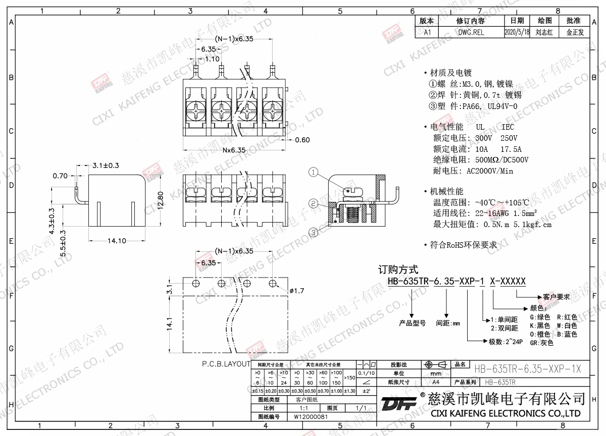 栅栏式接线端子 材质电镀:材质及电镀(Material)螺丝(Screw):M2.5,钢,镀镍Steel,NiPlated端子(Pinheader):黄铜,0.7t镀锡Brass,Tinplated塑件(Housing):PA66,UL94V-0·电气性能(Electrical)额定电压(RatedVoltage):300V额定电流(RatedCurrent):16A绝缘电阻