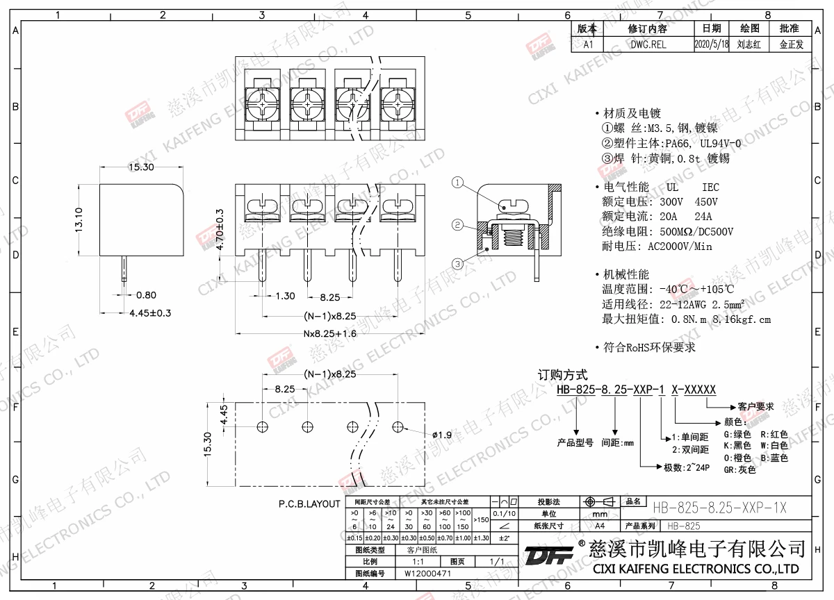 栅栏式接线端子 材质电镀:M3.5 钢,镀镍端子:黄铜,0.7t 镀镍塑件: PA66,UL94V-0电气性能ULIEC额定电压300V 450V 额定电流20A24A绝缘电阻500MΩ/DC500V耐电压AC2000V/1min使用线径22-12AWG 2.5mm²机械性能温度范围-40℃~+105℃ 扭矩0.8N.m 7.02Lb.in