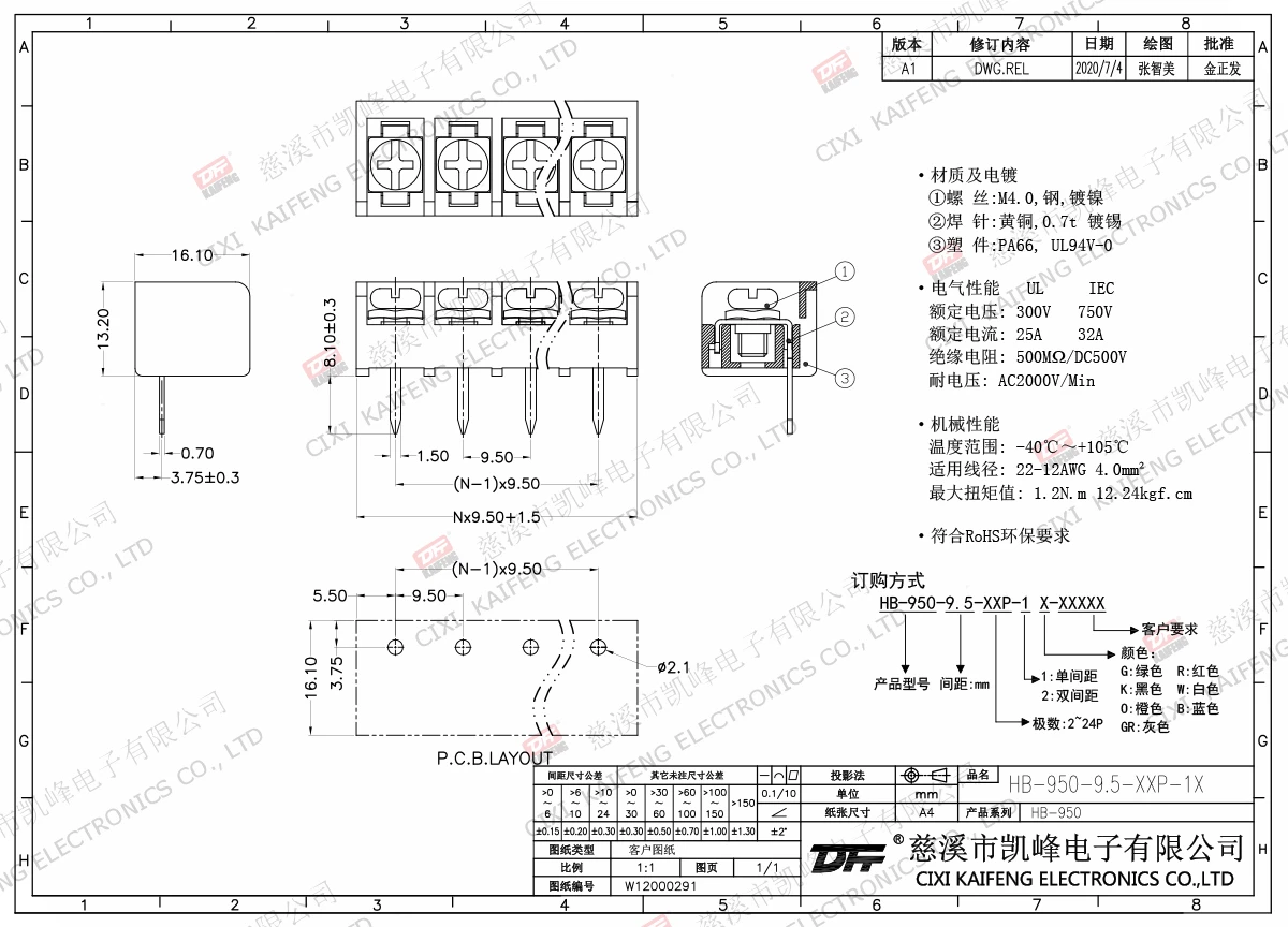 栅栏式接线端子 材质电镀:M4.0 钢,镀镍端子:黄铜,0.8t 镀镍塑件: PA66,UL94V-0电气性能ULIEC额定电压300V 750V 额定电流25A32A绝缘电阻500MΩ/DC500V耐电压AC2000V/1min使用线径22-12AWG 4.0mm²机械性能温度范围-40℃~+105℃ 扭矩1.2N.m 10.53Lb.in
