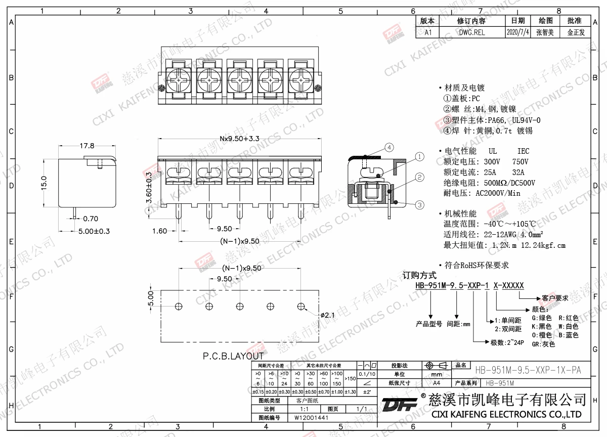 材质电镀:材质及电镀(Material)螺丝(Screw):M3.0,钢,镀镍Steel,NiPlated端子(Pinheader):黄铜,0.8t镀锡Brass,Tinplated塑件(Housing):PA66,UL94V-0·电气性能(Electrical)额定电压(RatedVoltage):300V额定电流(RatedCurrent):20A绝缘电阻