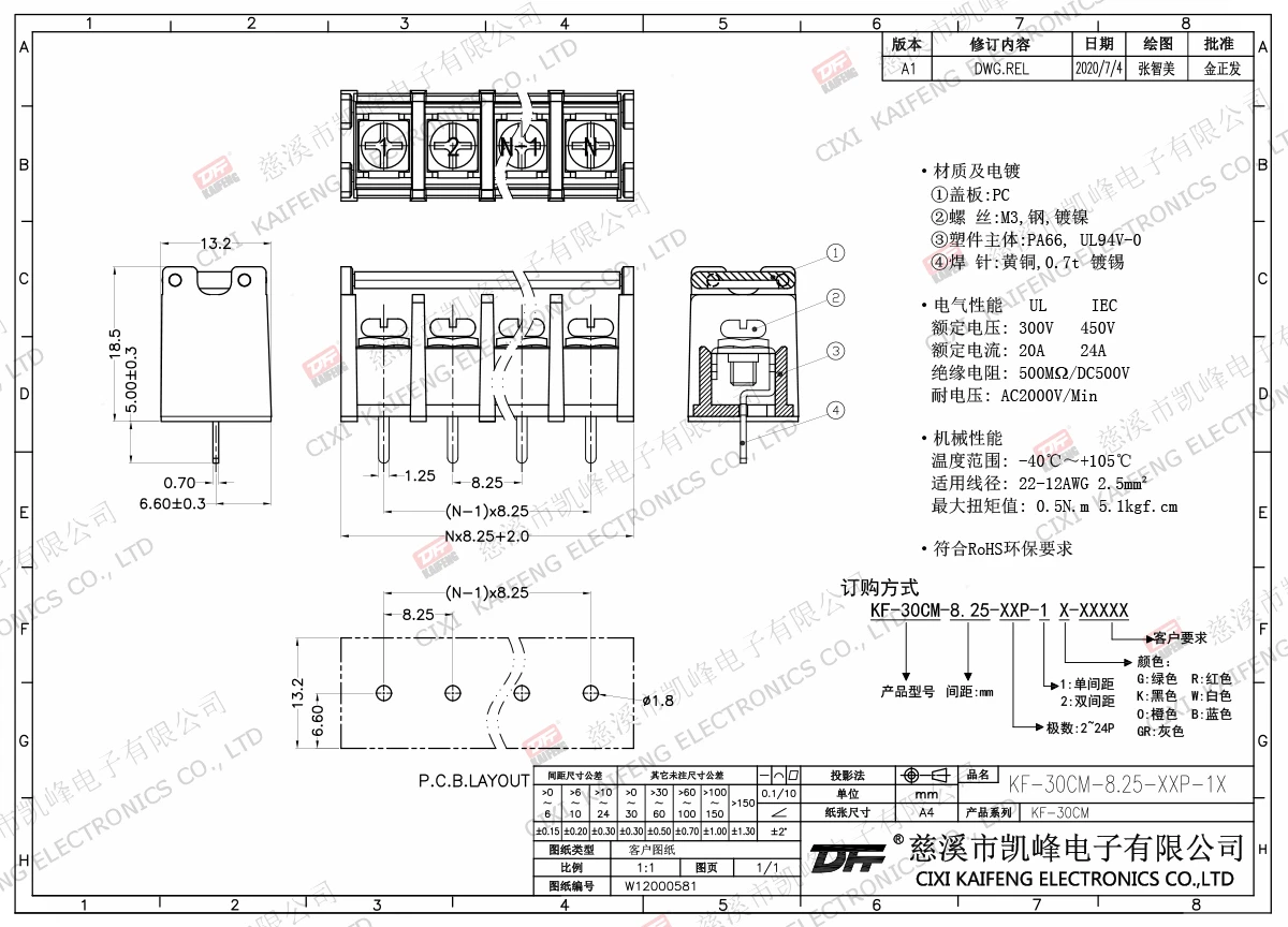 材质电镀:M3.0 钢,镀镍端子:黄铜,0.7t 镀镍塑件: PA66,UL94V-0电气性能ULIEC额定电压300V 450V 额定电流20A24A绝缘电阻500MΩ/DC500V耐电压AC2000V/1min使用线径22-12AWG 2.5mm²机械性能温度范围-40℃~+105℃ 扭矩0.5N.m 4.4Lb.in