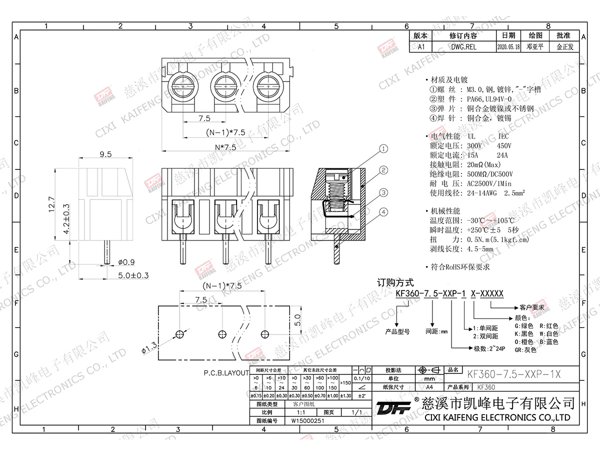 固定式连接端子 材质电镀:材质及电镀 ①螺 丝 : M3.0 钢,镀锌,"-"字槽 ②塑 件 : PA66, UL94V-0 ③弹 片 : 磷青铜镀镍或不锈钢