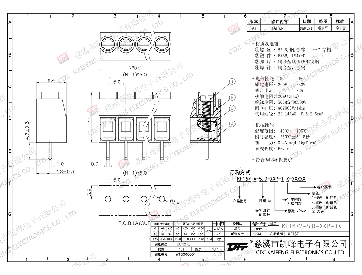 固定式连接端子 材质电镀:①螺 丝 : M2.5 钢 镀锌,"-"字槽 ②塑 件 : PA66, UL94V-0 ③弹 片 : 磷青铜镀镍或不锈钢