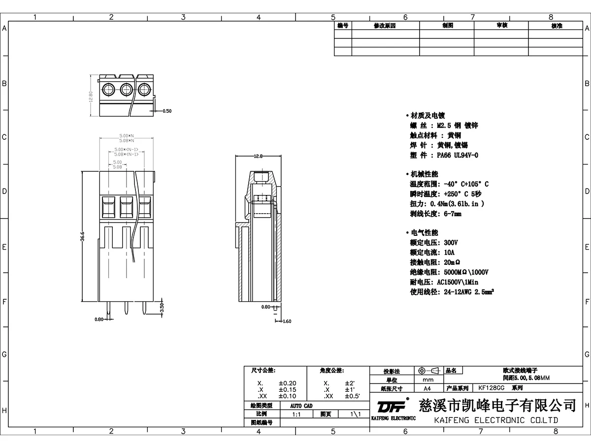 材质电镀:螺丝:M2.5,钢,镀锌触点:黄铜,镀镍焊针:黄铜,镀锡塑件:PA66,UL94V-0·电气性能额定电压:300V额定电流:10A接触电阻:20mΩ绝缘电阻:5000MΩ/1000V耐电压:AC1500V/1Min使用线径:24-12AWG2.5mm²·机械性能温度范围:-40℃~+105℃瞬时温度:+250℃,5秒扭矩:0.4Nm(3.6lb.in)剥线长度:6-7mm