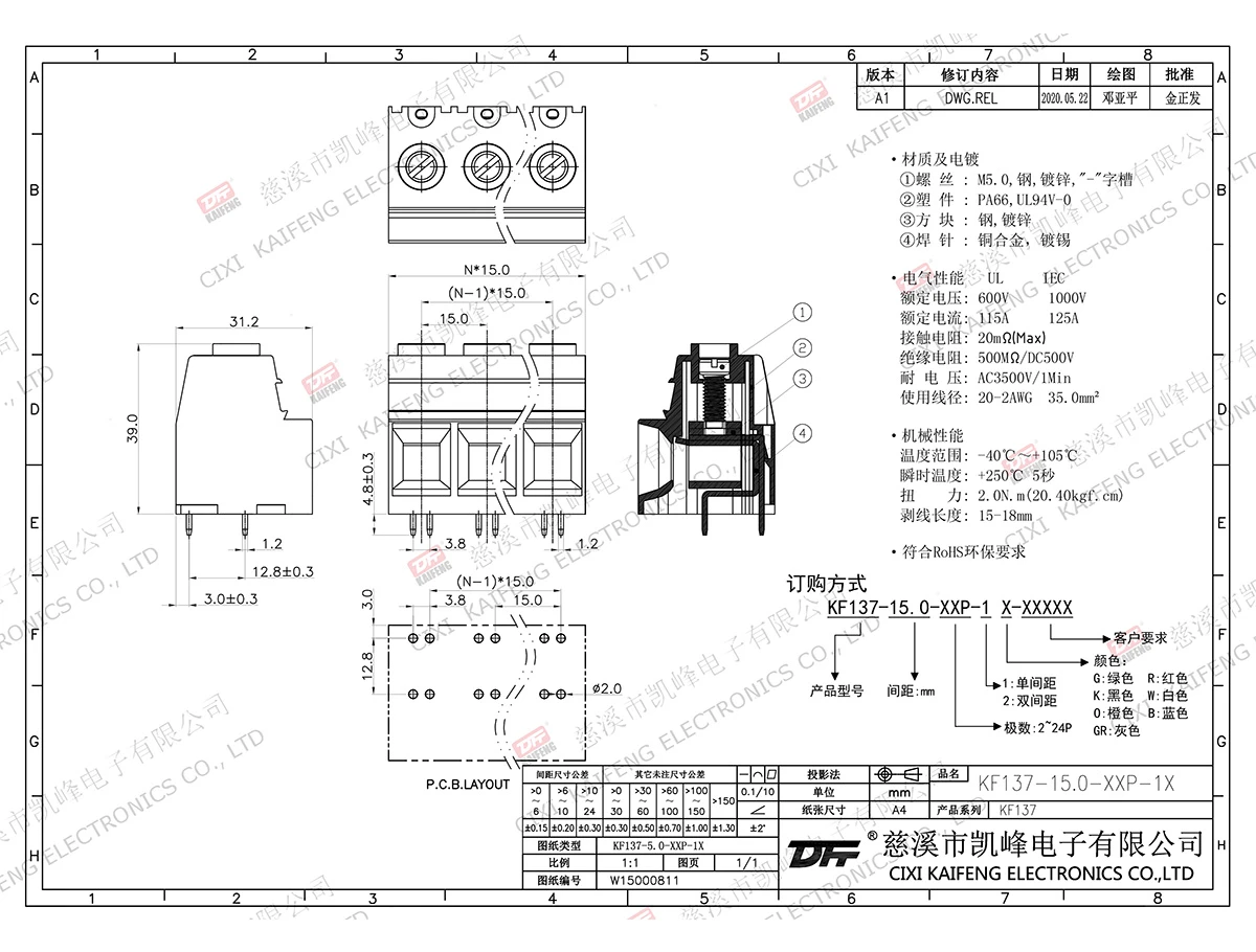 材质电镀:螺丝:M5钢镀锌材料:黄铜,镀镍焊针:黄铜,镀锡塑件:PA66UL94V-0·电气性能额定电压:600V额定电流:90A接触电阻:20m?绝缘电阻:5000M?\1000V耐电压:AC300V\1Min使用线径:22-2AWG25mm2·机械性能温度范围:-40℃∽+105℃瞬时温度:+250℃/5秒扭力:2Nm(17.54lb.in)剥线长度:15-18mm