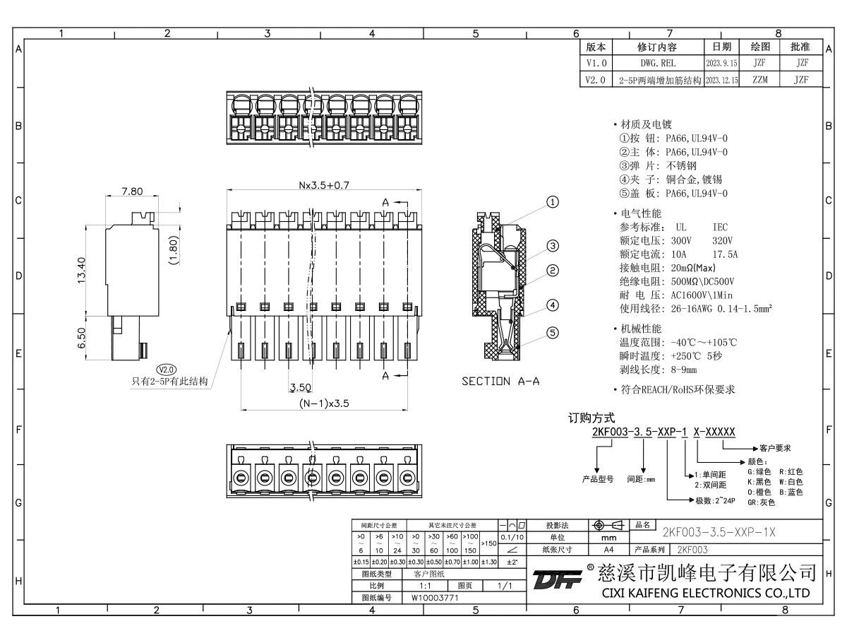 插拔式连接端子 材质电镀:①弹片:PA66,UL94V-0 ②夹子 : 不绣钢3 按钮:磷青铜电气性能UL IEC 额定电压300V 320V &