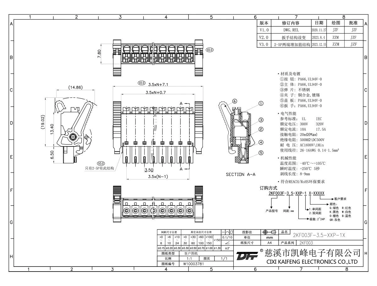 插拔式连接端子 材质电镀:①弹片:PA66,UL94V-0 ②夹子 : 不绣钢3 按钮:磷青铜电气性能UL IEC 额定电压300V 320V &