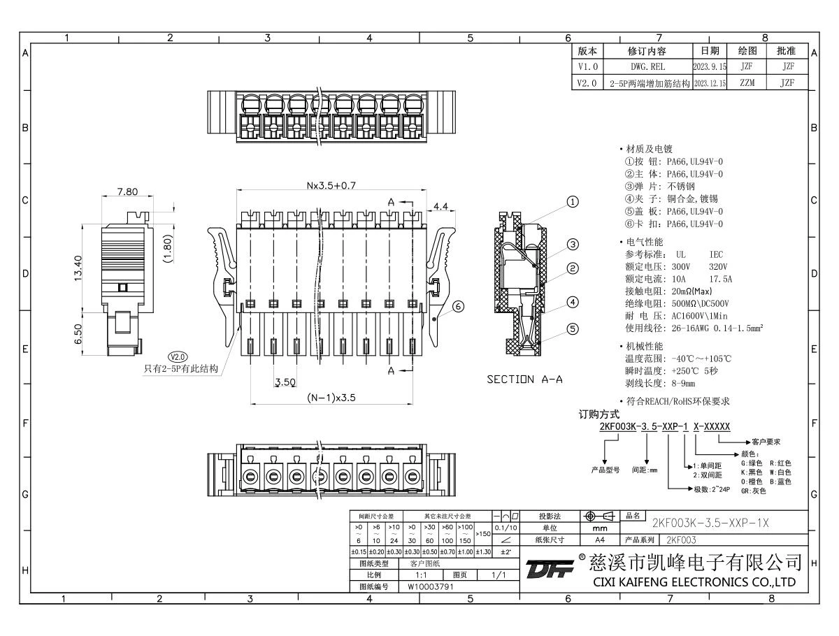 插拔式连接端子 材质电镀:①弹片:PA66,UL94V-0 ②夹子 : 不绣钢3 按钮:磷青铜电气性能UL IEC 额定电压300V 320V &