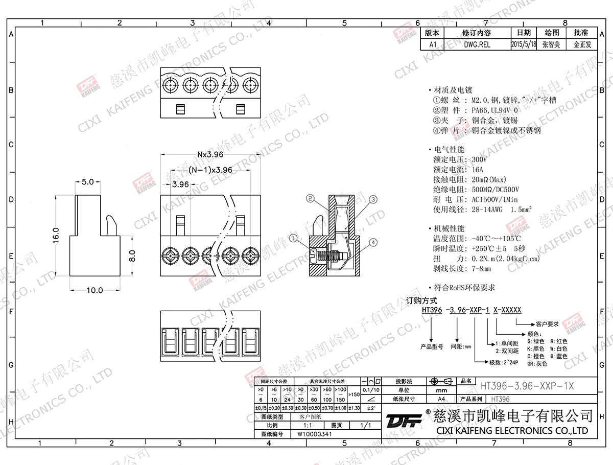 材质电镀:M2.0,钢,镀锌触点: 磷青铜焊针: -塑件: PA66,UL94V-0电气性能ULIEC额定电压300V 250V 额定电流10A15A接触电阻20mΩ绝缘电阻500MΩ/DC500V耐电压AC1500V/1min使用线径28-14AWG 1.5mm²机械性能温度范围-40℃~+105℃ 瞬时温度+250℃, 5s