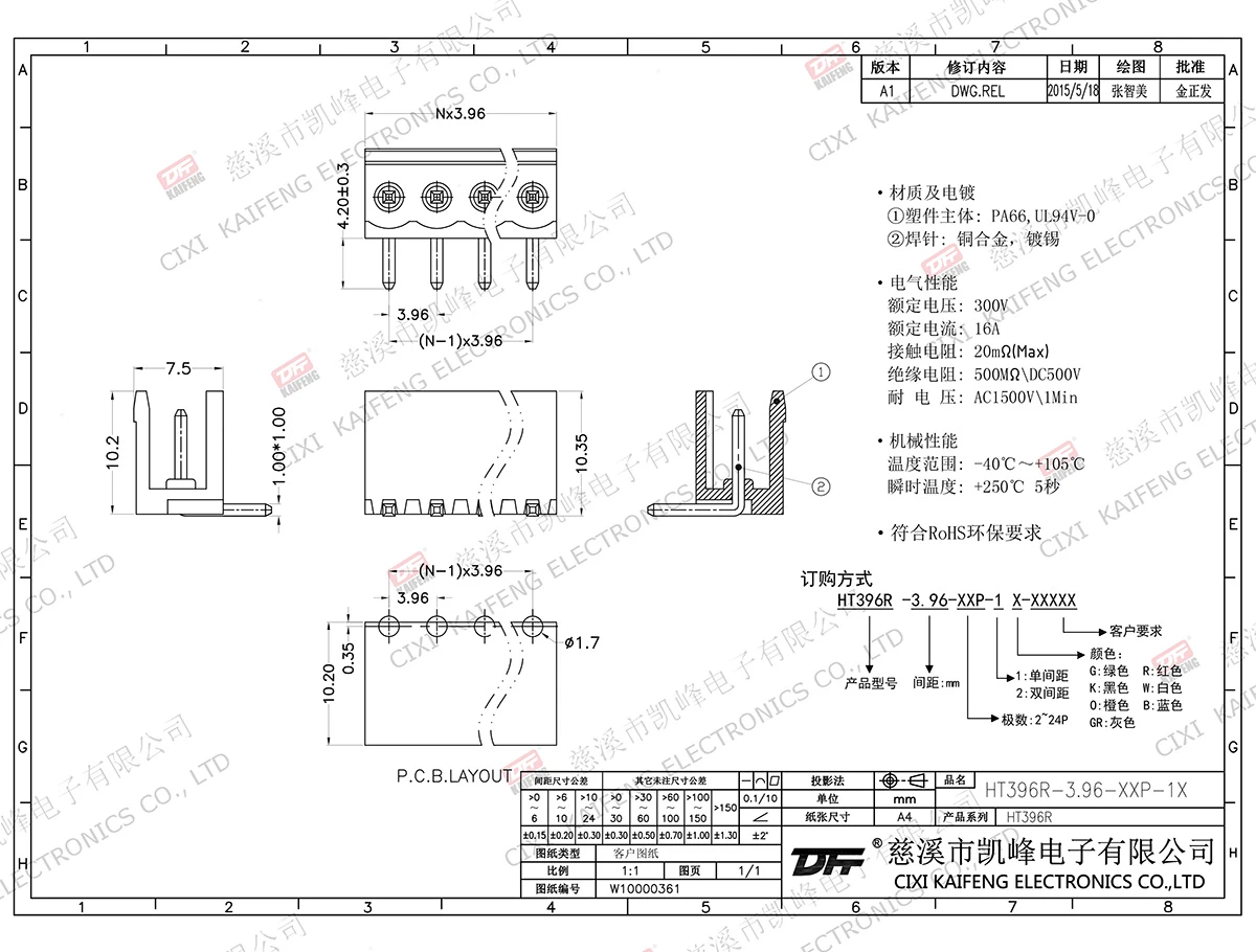 插拔式连接端子 材质电镀:M2.0,钢,镀锌触点: 磷青铜焊针: -塑件: PA66,UL94V-0电气性能ULIEC额定电压300V 250V 额定电流10A15A接触电阻20mΩ绝缘电阻500MΩ/DC500V耐电压AC1500V/1min使用线径28-14AWG 1.5mm²机械性能温度范围-40℃~+105℃ 瞬时温度+250℃, 5s