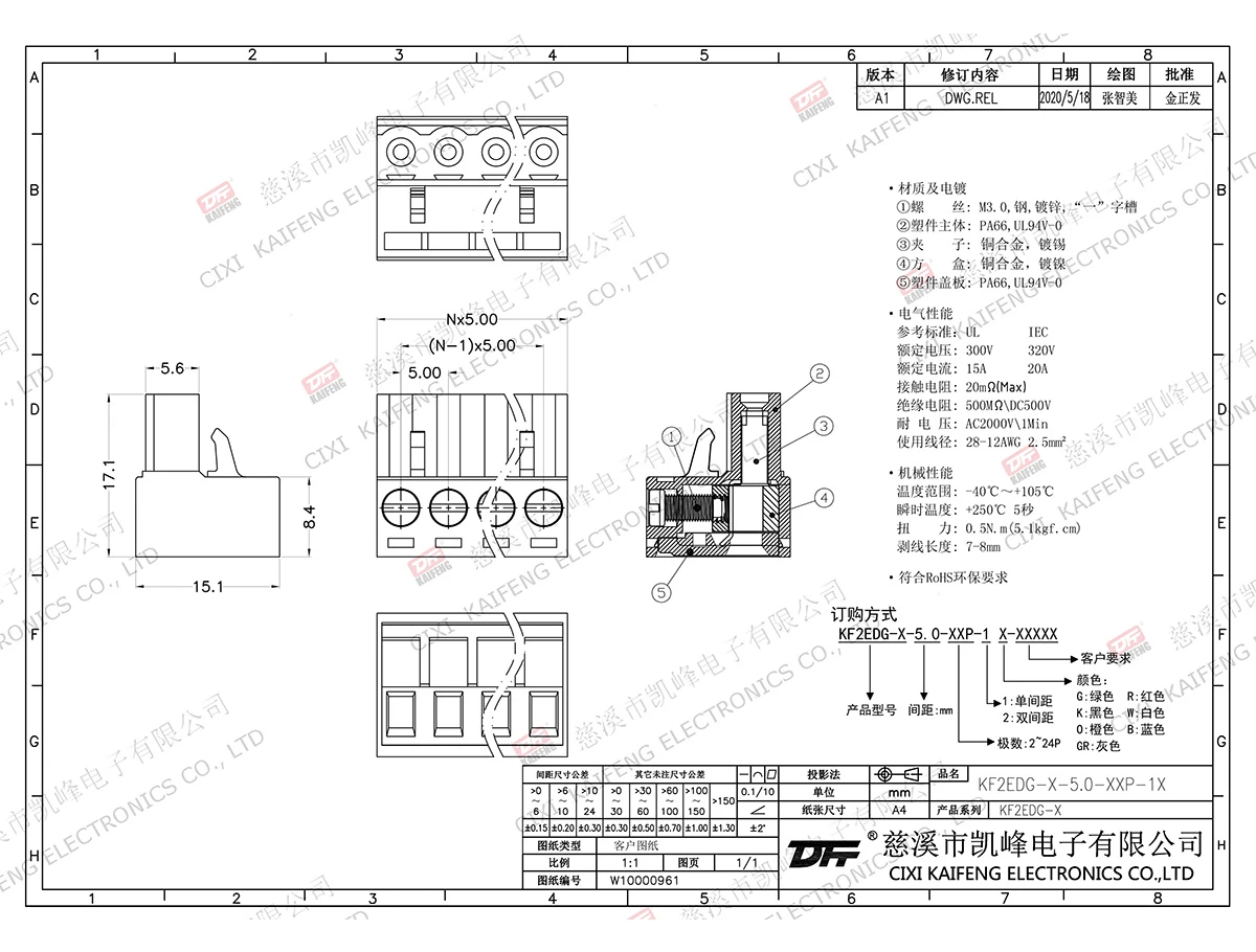 插拔式连接端子 材质电镀:M3.0 钢 镀锌 触点: 磷青铜焊针:-塑件: PA66,UL94V-0电气性能ULIEC额定电压300V 320V 额定电流15A20A接触电阻20mΩ绝缘电阻500MΩ/DC500V耐电压AC2000V/1min使用线径28-12AWG 2.5㎜²机械性能温度范围-40℃~+105℃ 瞬时温度+250℃,5se