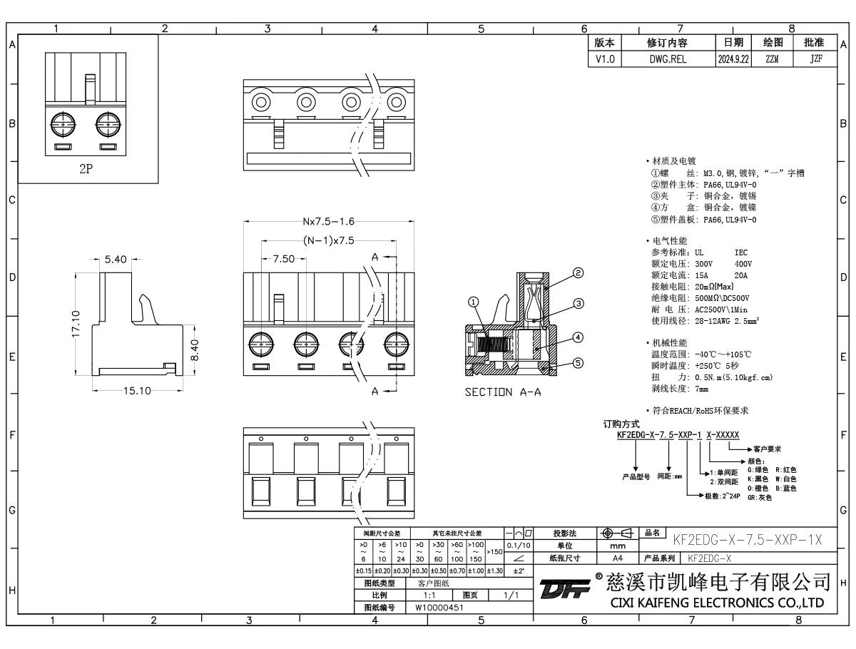材质电镀:M2.5,钢,镀锌触点: 磷青铜焊针: -塑件: PA66,UL94V-0电气性能ULIEC额定电压300V 400V 额定电流15A20A接触电阻20mΩ绝缘电阻500MΩ/DC500V耐电压AC2500V/1min使用线径28-12AWG 2.5mm²机械性能温度范围-40℃~+105℃ 瞬时温度+250℃, 5s