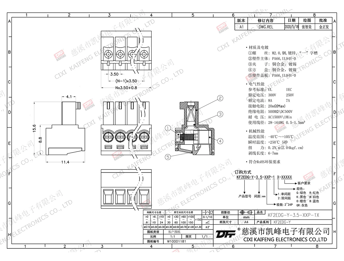 插拔式连接端子 材质电镀:M2.0,钢,镀锌触点: 磷青铜焊针: -塑件: PA66,UL94V-0电气性能ULIEC额定电压300V 250V 额定电流8A7A接触电阻20mΩ绝缘电阻500MΩ/DC500V耐电压AC1500V/1min使用线径28-16AWG 0.5-1.5mm²机械性能温度范围-40℃~+105℃ 瞬时温度+250℃,