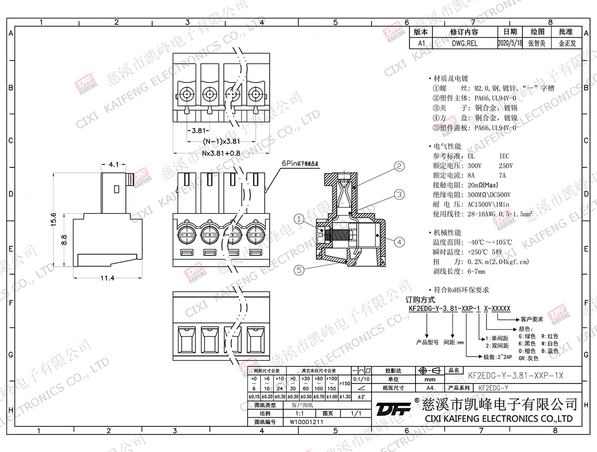 插拔式连接端子 材质电镀:M2.0,钢,镀锌触点: 磷青铜焊针: -塑件: PA66,UL94V-0电气性能ULIEC额定电压300V 250V 额定电流8A7A接触电阻20mΩ绝缘电阻500MΩ/DC500V耐电压AC1500V/1min使用线径28-16AWG 0.5-1.5mm²机械性能温度范围-40℃~+105℃ 瞬时温度+250℃,