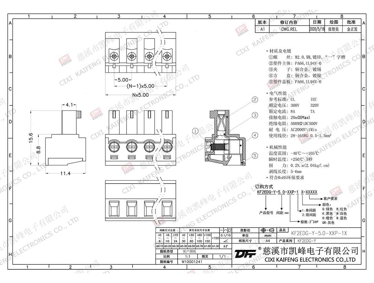 材质电镀:M2.0,钢,镀锌触点: 磷青铜焊针: -塑件: PA66,UL94V-0电气性能ULIEC额定电压300V 320V 额定电流8A7A接触电阻20mΩ绝缘电阻500MΩ/DC500V耐电压AC2000V/1min使用线径28-16AWG 0.5-1.5mm²机械性能温度范围-40℃~+105℃ 瞬时温度+250℃,