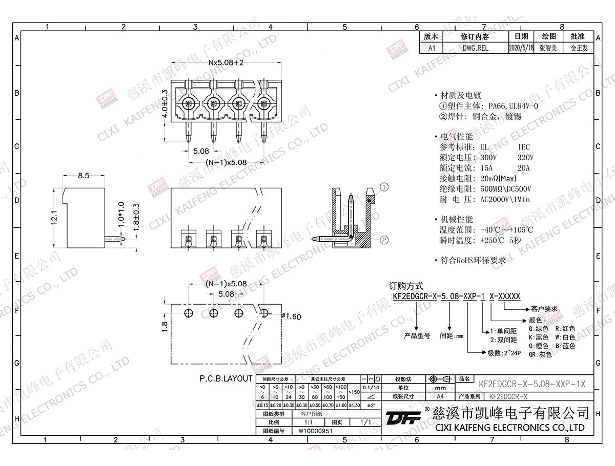 插拔式连接端子 材质电镀:触点: -焊针: 黄铜,镀锡塑件: PA66,UL94V-0电气性能ULIEC额定电压300V 320V 额定电流15A20A接触电阻20mΩ绝缘电阻500MΩ/DC500V耐电压AC2000V/1min使用线径-机械性能温度范围-40℃~+105℃ 瞬时温度+250℃,5sec扭矩-剥线长度-