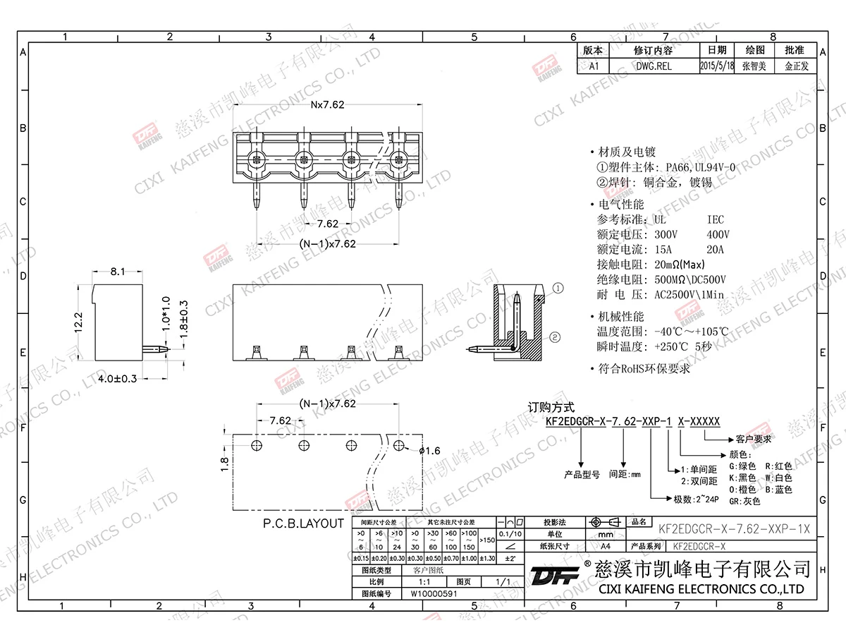 材质电镀:触点: -焊针: 黄铜,镀锡塑件: PA66,UL94V-0电气性能ULIEC额定电压300V 400V 额定电流15A20A接触电阻20mΩ绝缘电阻500MΩ/DC500V耐电压AC2500V/1min使用线径-机械性能温度范围-40℃~+105℃ 瞬时温度+250℃, 5sec扭矩-剥线长度-