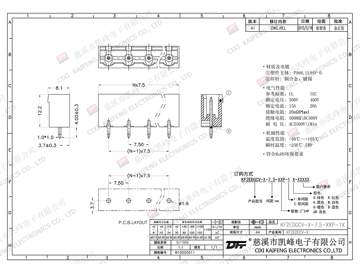 材质电镀:M3.0,钢夹子: -触点: -焊针: 黄铜,镀锡塑件: PA66,UL94V-0电气性能ULIEC额定电压300V 400V 额定电流15A20A接触电阻20mΩ绝缘电阻500MΩ/DC500V耐电压AC2500V/1min使用线径-机械性能温度范围-40℃~+105℃ 瞬时温度+250℃, 5sec扭矩-剥线长度-