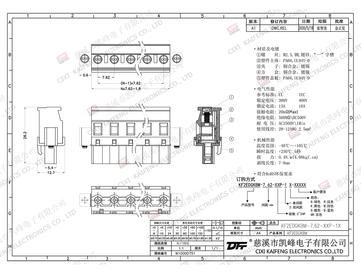 材质电镀:M2.5,钢,镀锌触点: 磷青铜焊针: -塑件: PA66,UL94V-0电气性能ULIEC额定电压300V 400V 额定电流15A10A接触电阻20mΩ绝缘电阻500MΩ/DC500V耐电压AC2500V/1min使用线径28-12AWG 2.5mm²机械性能温度范围-40℃~+150℃ 瞬时温度+250℃, 5s