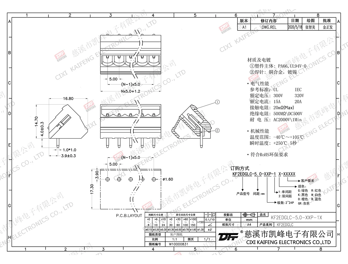 材质电镀:触点: -焊针: 黄铜,镀锡塑件: PA66,UL94V-0电气性能ULIEC额定电压300V 320V 额定电流15A20A接触电阻20mΩ绝缘电阻500MΩ/DC500V耐电压AC2000V/1min使用线径-机械性能温度范围-40℃~+105℃ 瞬时温度+250℃, 5sec扭矩-剥线长度-