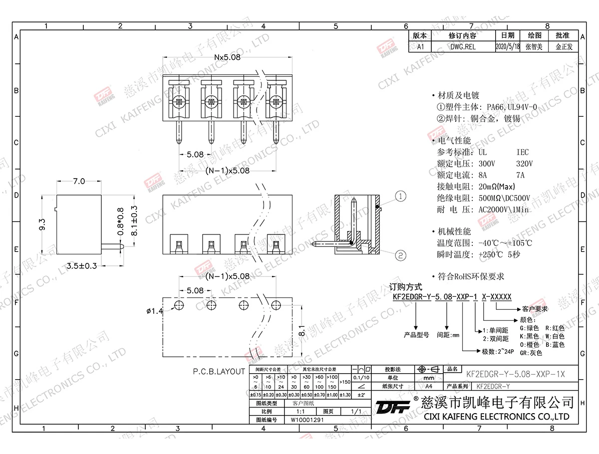 材质电镀:触点: -焊针: 黄铜,镀锡塑件: PA66,UL94V-0电气性能ULIEC额定电压300V 320V 额定电流8A7A接触电阻20mΩ绝缘电阻500MΩ/DC500V耐电压AC2000V/1min使用线径-机械性能温度范围-40℃~+105℃ 瞬时温度+250℃,5sec扭矩-剥线长度-