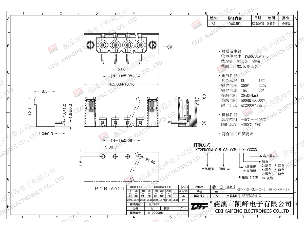 材质电镀:材质及电镀螺丝:-触点: -焊针: 黄铜,镀锡塑件: PA66,UL94V-0电气性能ULIEC额定电压300V 320V 额定电流15A20A接触电阻20mΩ绝缘电阻500MΩ/DC500V耐电压AC2000V/1min使用线径-机械性能温度范围-40℃~+105℃ 瞬时温度+250℃, 5sec扭矩-剥线长度-
