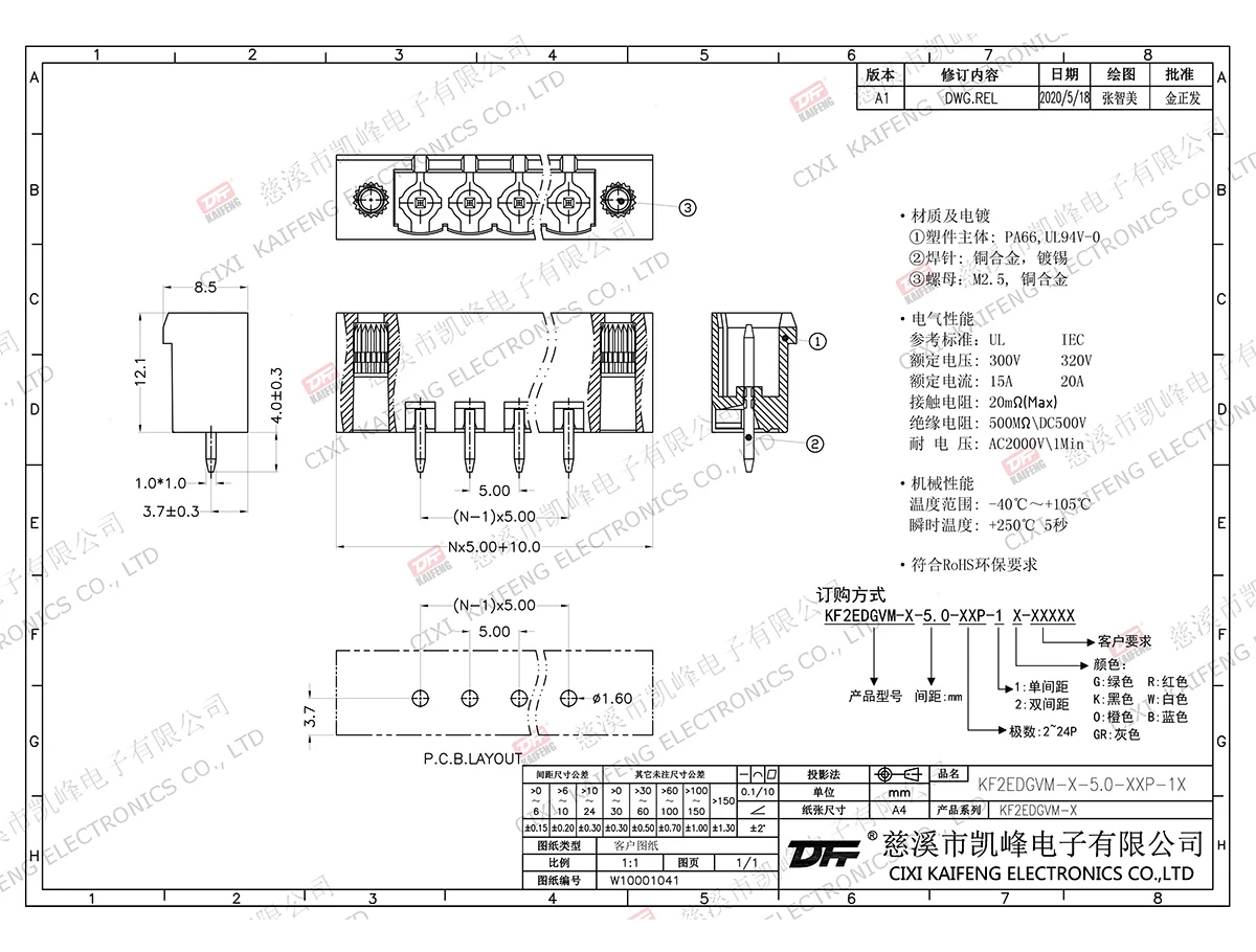 材质电镀:材质及电镀螺丝: -触点: -焊针: 黄铜,镀锡塑件: PA66,UL94V-0电气性能ULIEC额定电压300V 320V 额定电流15A20A接触电阻20mΩ绝缘电阻500MΩ/DC500V耐电压AC2000V/1min使用线径-机械性能温度范围-40℃~+105℃ 瞬时温度+250℃, 5sec扭矩-剥线长度-