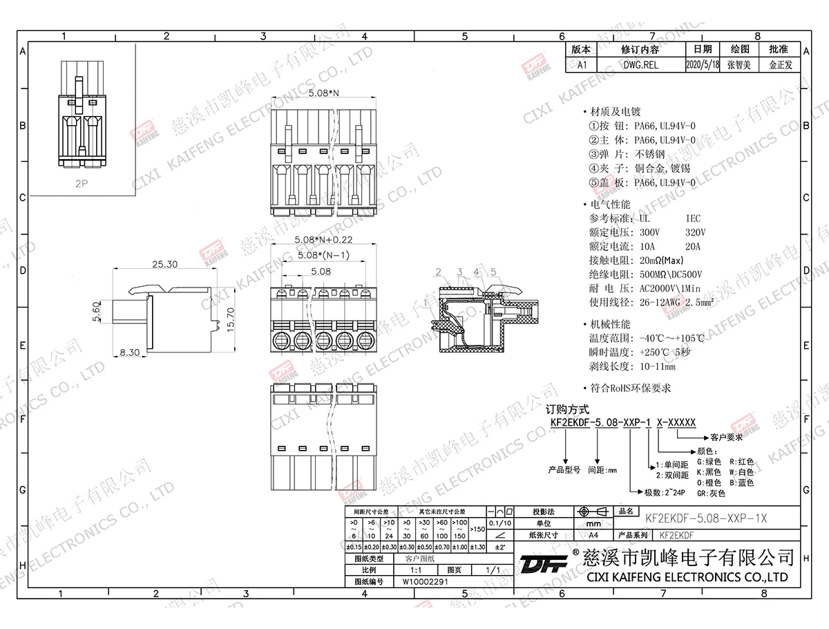 材质电镀:材质及电镀夹子: 磷青铜,镀锡触点: -弹片: 不锈钢塑件: PA66,UL94V-0电气性能ULIEC额定电压300V 320V 额定电流10A20A接触电阻20mΩ绝缘电阻500MΩ/DC500V耐电压AC2000V/1min使用线径26-12AWG 2.5mm²机械性能温度范围-40℃~+105℃ 瞬时温度+250℃, 5sec扭矩