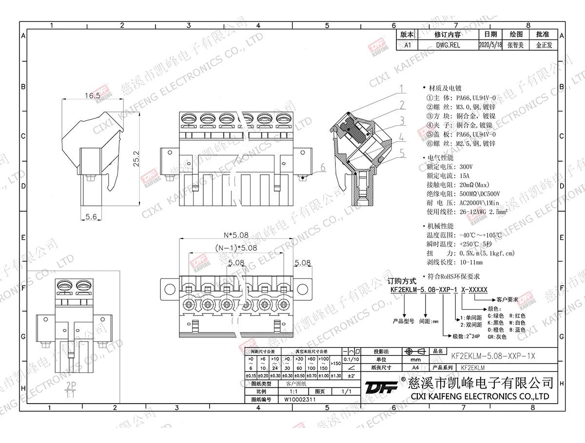 插拔式连接端子 材质电镀:材质及电镀螺丝: M3.0,不绣钢触点: 磷青铜焊针: -塑件: PA66,UL94V-0电气性能IEC额定电压300V --额定电流15A--接触电阻20mΩ绝缘电阻500MΩ/DC500V耐电压AC2000V/1min使用线径26-12AWG 2.5mm²机械性能温度范围-40℃~+105℃ 瞬时温度+250℃, 5sec扭矩0.5N.m 5.