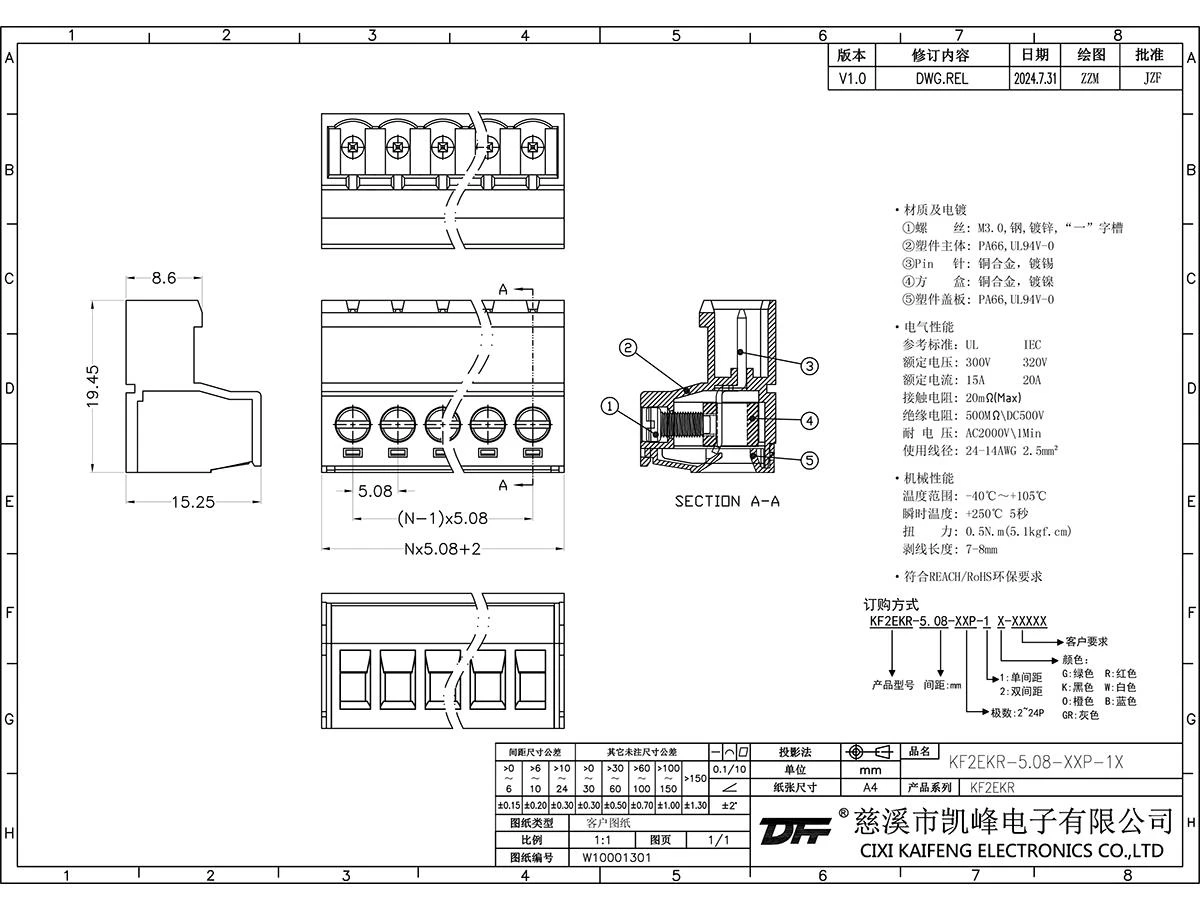 插拔式连接端子 材质电镀:材质及电镀螺丝: M3.0,钢,镀锌触点: 磷青铜焊针: -塑件: PA66,UL94V-0电气性能ULIEC额定电压300V 320V 额定电流15A20A接触电阻20mΩ绝缘电阻500MΩ/DC500V耐电压AC2000V/1min使用线径24-14AWG 2.5mm²机械性能温度范围-40℃~+105℃ 瞬时温度+25