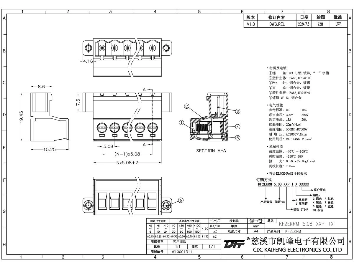材质电镀:材质及电镀螺丝: M3.0,钢,镀锌触点: 磷青铜焊针: -塑件: PA66,UL94V-0电气性能ULIEC额定电压300V 320V 额定电流15A20A接触电阻20mΩ绝缘电阻500MΩ/DC500V耐电压AC2000V/1min使用线径24-14AWG 2.5mm²机械性能温度范围-40℃~+105℃ 瞬时温度+250℃, 5s