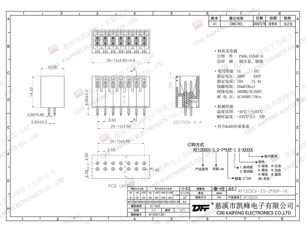 插拔式连接端子 材质电镀:①焊脚:铜合金,镀锡②塑件 : PA66,UL94V-0 电气性能UL IEC 额定电压150V 320V