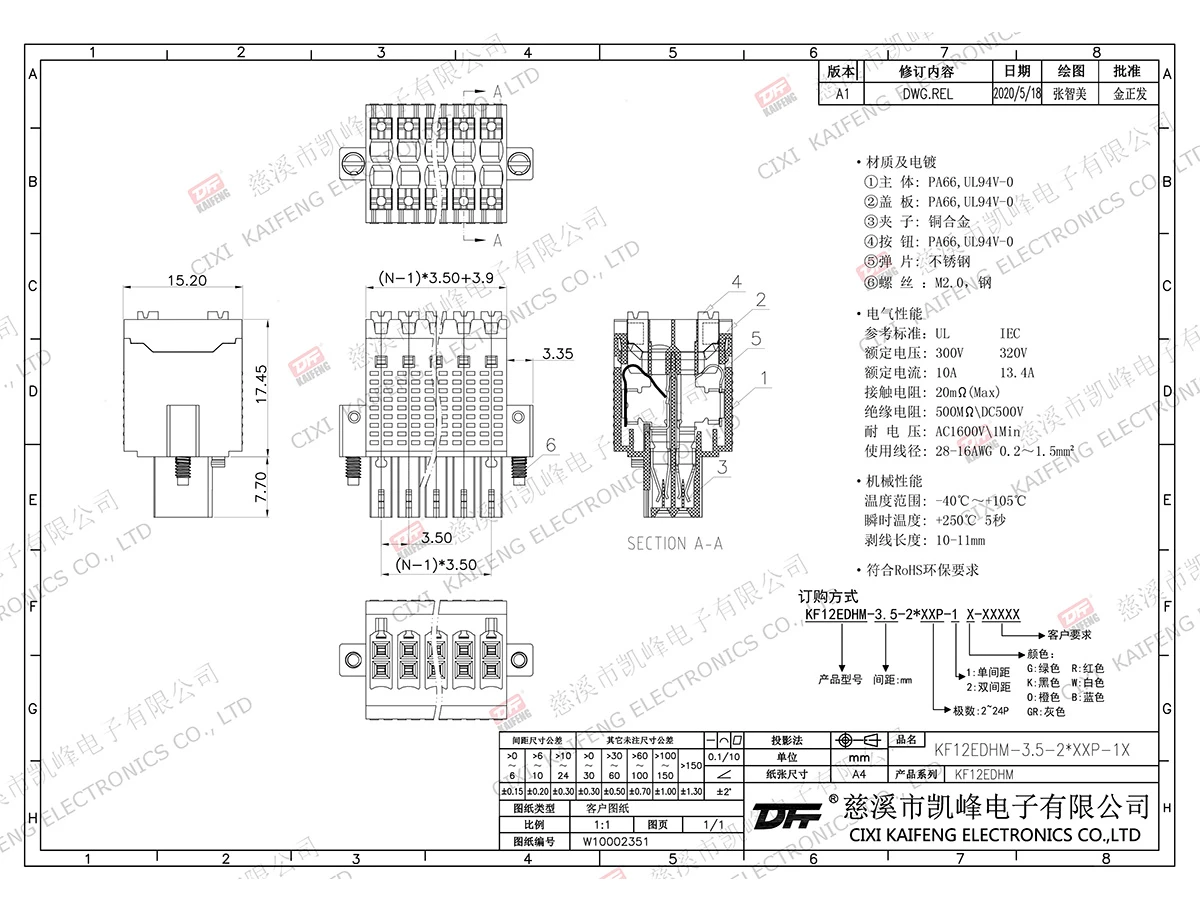 材质电镀:PA66,UL94V-0盖板:PA66,UL94V-0夹子:磷青铜按钮:PA66,UL94V-0弹片:不锈钢螺丝:M2.0 ,钢电气性能ULIEC额定电压300V 320V 额定电流10A13.4A接触电阻20mΩ(Max)绝缘电阻500MΩ/DC500V耐电压AC1600V/1min使用线径28-16AWG 0.2-1.5mm²机械性能温度范围-4