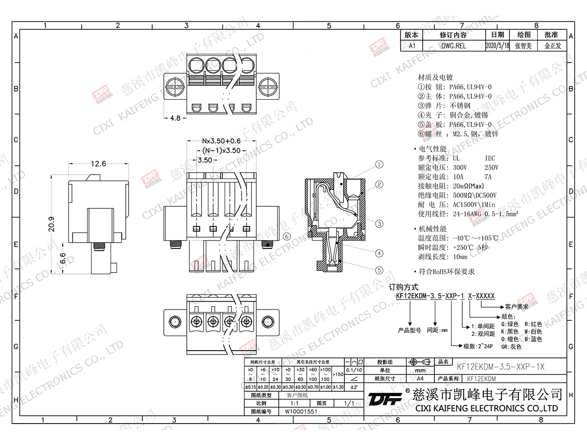 材质电镀:-触点: 磷青铜焊针: -塑件: PA66,UL94V-0电气性能ULIEC额定电压300V 250V 额定电流10A7A接触电阻20mΩ绝缘电阻500MΩ/DC500V耐电压AC1500V/1min使用线径24-16AWG 0.5-1.5mm²机械性能温度范围-40℃~+105℃ 瞬时温度+250℃, 5sec扭矩-