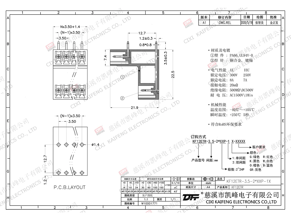 材质电镀:触点: -焊针: 黄铜,镀锡塑件: PA66,UL94V-0电气性能ULIEC额定电压300V 250V 额定电流8A7A接触电阻20mΩ绝缘电阻500MΩ/DC500V耐电压AC1500V/1min使用线径-机械性能温度范围-40℃~+105℃ 瞬时温度+250℃, 5sec扭矩-剥线长度-