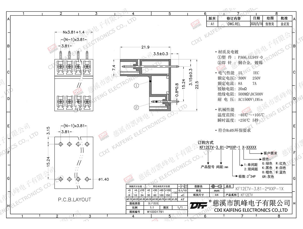 材质电镀:触点: -焊针: 黄铜,镀锡塑件: PA66,UL94V-0电气性能ULIEC额定电压300V 250V 额定电流8A7A接触电阻20mΩ绝缘电阻500MΩ/DC500V耐电压AC1500V/1min使用线径-机械性能温度范围-40℃~+105℃ 瞬时温度+250℃, 5sec扭矩-剥线长度-