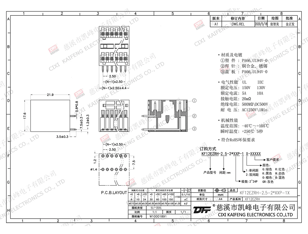 插拔式连接端子 材质电镀:触点: -焊针: 黄铜,镀锡塑件: PA66,UL94V-0电气性能ULIEC额定电压150V 130V 额定电流5A10A接触电阻20mΩ绝缘电阻500MΩ/DC500V耐电压AC1250V/1min使用线径-机械性能温度范围-40℃~+105℃ 瞬时温度+250℃,5sec扭矩-剥线长度-