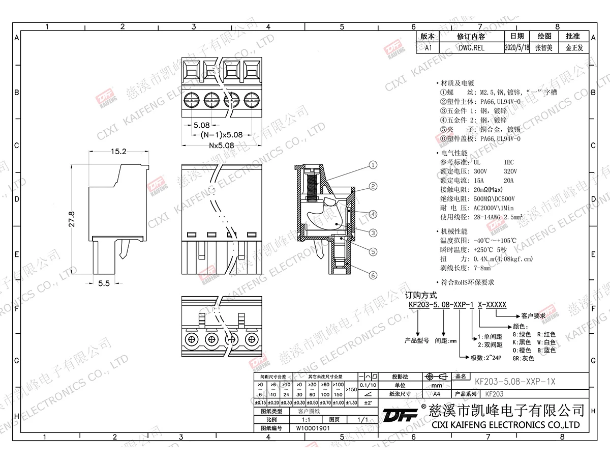 材质电镀:材质及电镀螺丝: M2.5,钢,镀锌触点: 磷青铜焊针: -塑件: PA66,UL94V-0电气性能ULIEC额定电压300V 320V/400V额定电流15A20A接触电阻20mΩ绝缘电阻500MΩ/DC500V耐电压AC2000V/1min使用线径28-14AWG 2.5mm²机械性能温度范围-40℃~+105℃ 瞬时温度+250℃, 5se