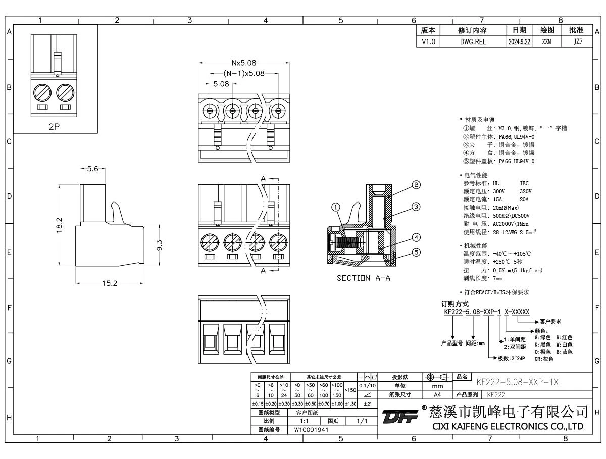 材质电镀:材质及电镀螺丝: M2.5,钢,镀锌触点: 磷青铜焊针: -塑件: PA66,UL94V-0电气性能ULIEC额定电压300V 320V 额定电流15A20A接触电阻20mΩ绝缘电阻500MΩ/DC500V耐电压AC2000V/1min使用线径28-12AWG 2.5mm²机械性能温度范围-40℃~+105℃ 瞬时温度+250℃, 5s
