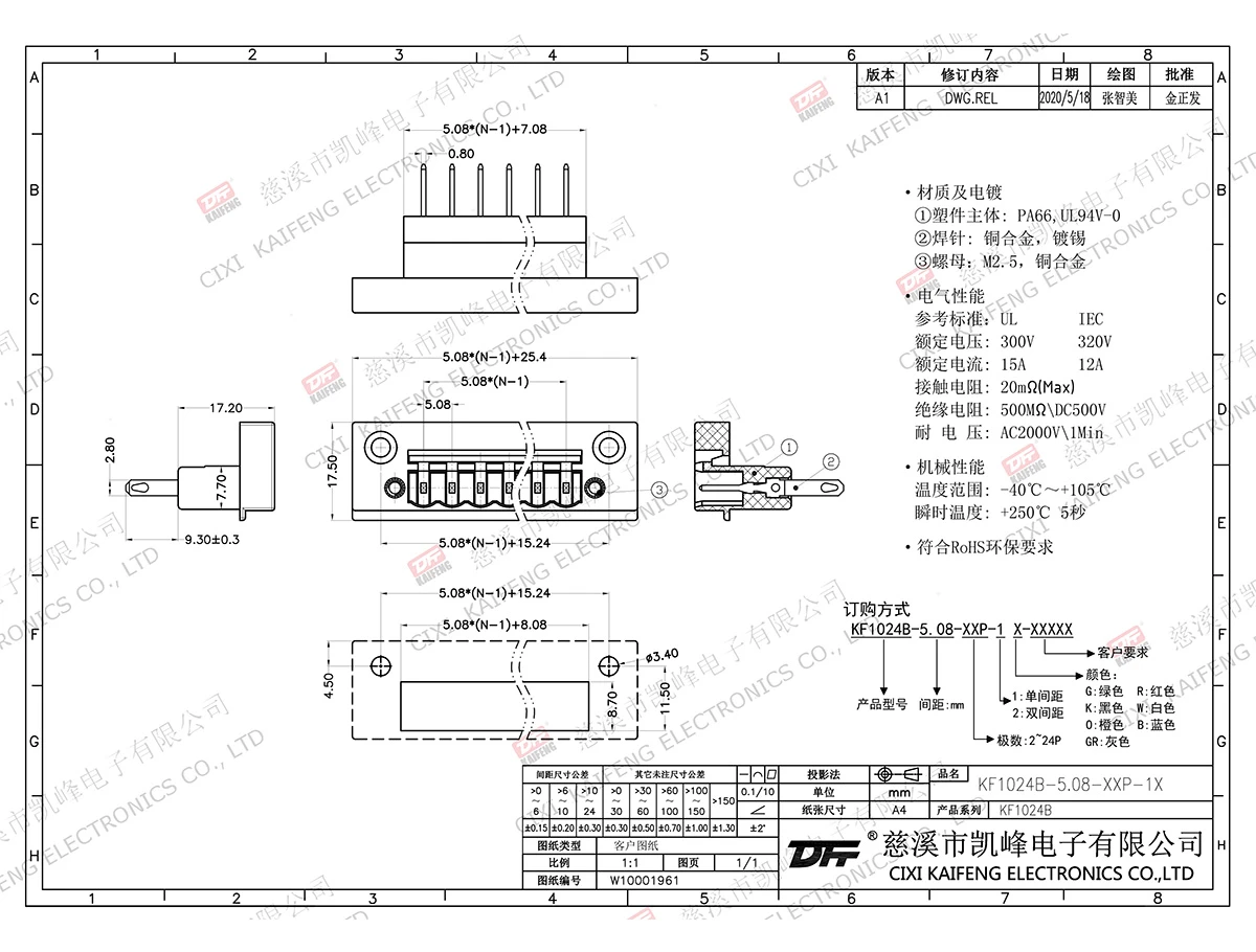 材质电镀:-黄铜触点: -焊针: 黄铜,镀锡塑件: PA66,UL94V-0电气性能ULIEC额定电压300V 320V 额定电流15A20A接触电阻20mΩ绝缘电阻500MΩ/DC500V耐电压AC2000V/1min使用线径-机械性能温度范围-40℃~+105℃ 瞬时温度+250℃, 5sec扭矩-剥线长度-