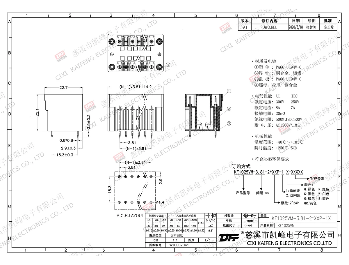 材质电镀:触点: -焊针: 黄铜,镀锡塑件: PA66,UL94V-0电气性能ULIEC额定电压300V 250V 额定电流8A7A接触电阻20mΩ绝缘电阻500MΩ/DC500V耐电压AC1500V/1min使用线径-机械性能温度范围-40℃~+105℃ 瞬时温度+250℃, 5sec扭矩-剥线长度-