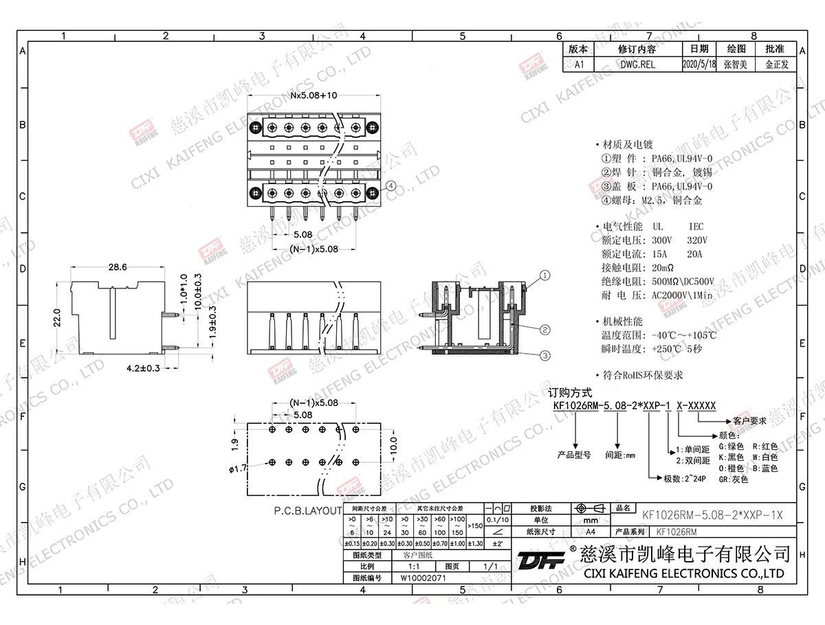 材质电镀:材质及电镀螺丝: -触点: -焊针: 黄铜,镀锡塑件: PA66,UL94V-0电气性能ULIEC额定电压300V 320V 额定电流15A20A接触电阻20mΩ绝缘电阻500MΩ/DC500V耐电压AC2000V/1min使用线径-机械性能温度范围-40℃~+105℃ 瞬时温度+250℃, 5sec扭矩-剥线长度-