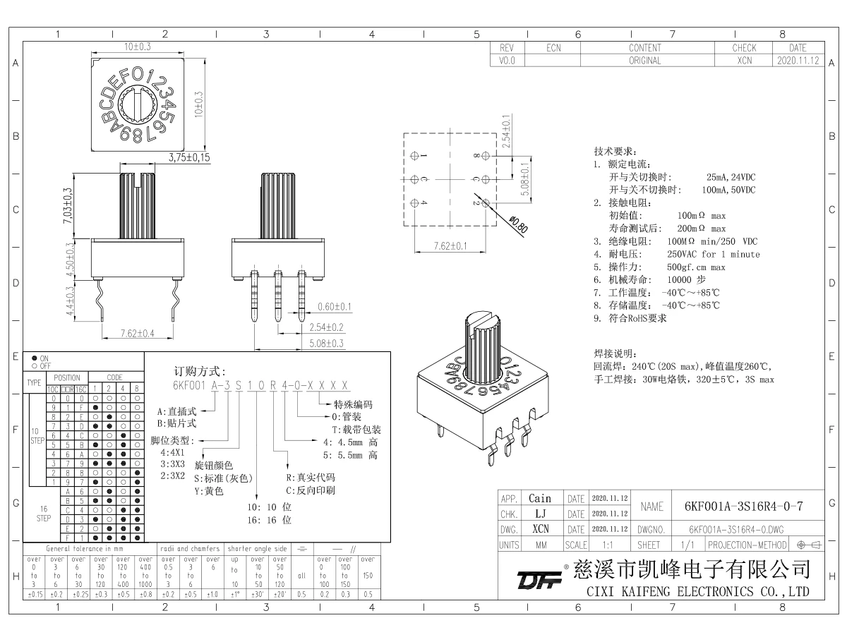 旋钮开关 材质电镀:25mA,24VDC 开与关不切换时:100mA,50VDC 接触电阻初始值:100mΩ max寿命测试后:200mΩ max绝缘电阻 :100mΩ min/250 VDC耐电压 :250VAC for 1 minute操作力 :500gf.cm max机械寿命 :10000步